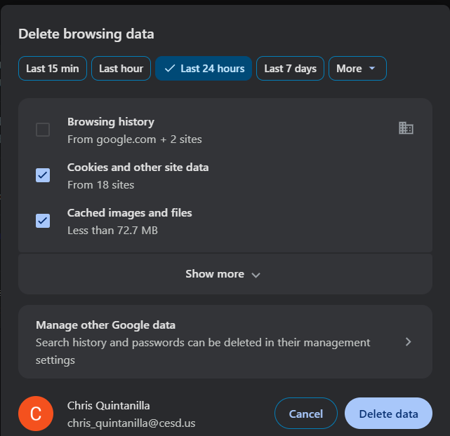 Solution: This is due to a UI bug in the browser. Log out of office 365. Clear cache and cookies up to 4 weeks in the chrome browser and try logging back into office 365. You should see the original black icon for CESD in the apps list. If not, clear cache and cookies and use the "All time" setting.
